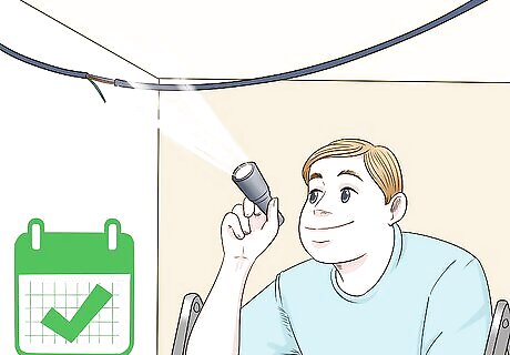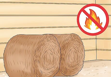 Reduce the risk of fire. Eliminate fuel sources, such as baled hay, extra bedding, cobwebs, dust, and excess vegetation growing around the stable. Have the stable professionally wired, and keep all lights covered instead of using bare lightbulbs. If possible, store baled hay and extra bedding in a separate structure. Clean the stable daily, sweep away cobwebs and dust, and keep the area around the stable well-mowed. You should also keep a working smoke or heat detector in the stable. Keep an eye on all wiring, as small vermin such as mice and voles may chew on them and make them a fire hazard.