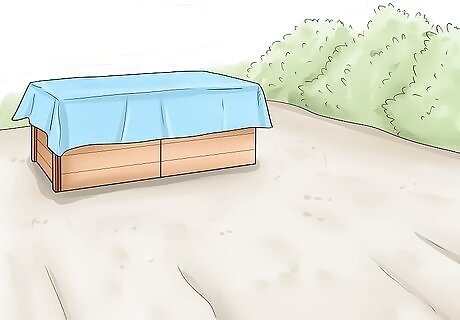 Choose a suitable site for composting. Your composting site should be on high ground and covered with a tarp when you’re not turning, airing, or adding to it. It should be located at minimum recommended distances from these sensitive areas: 50 to 100 feet (15 to 30 meters) from your property line 200 to 500 feet (about 60 to 150 meters) from a residence or place of business 100 to 200 feet (30 to 60 meters) from a source of potable water, stream, pond, or wetland