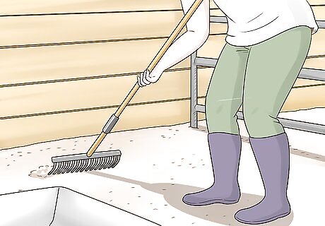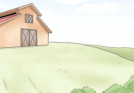 Build an enclosed structure on high ground to promote good drainage. Choose the highest available spot on your property. Remove vegetation, roots, and topsoil, and compact the subsoil below to prevent settling. Cover the compacted subsoil with 4 to 5 inches (10 to 13 centimeters) of gravel, 2 inches (5 centimeters) of sand or pea gravel, and at least 4 inches (10 centimeters) of stall flooring material, such as straw or wood shavings. To compact the subsoil, smooth it with a rake or shovel, then stamp on it wearing your heaviest pair of work boots. Spray the area evenly with a hose, let the water soak in, then repeat the process until the ground is hard and level.