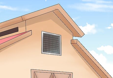 Provide ventilation with windows and openings at the eave. Poor ventilation is a health risk, so each individual stall in your indoor stable should have a window that opens. Above each stall, there should be a permanent opening at the eave, which is where the sidewall meets the roof. Prevent birds and other unwanted animals from entering the stable by covering the eave openings with wire mesh. Ideally each end of the barn should have big barn doors for extra ventilation, temperature control, and emergency exits for the horses.