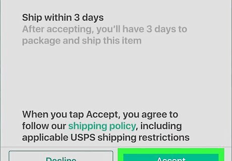 Accept the buyer’s offer. This charges the buyer for the item and creates a shipping label. Once you accept an offer, you’ll have 6 days to ship the item. Here’s how to accept the offer: Tap the Offers icon (the price-tag at the bottom of the screen). Tap the item. Tap the conversation with the buyer whose offer you want to accept. Tap View Offer. Tap Accept. If you’ve already accepted the offer, tap View Label to see the shipping label.