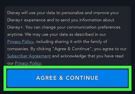Review the terms and click Agree & Continue. By clicking the blue button, you agree to abide by the Subscriber Agreement and accept Disney's Privacy Policy, both of which you can read by clicking the links above the button.