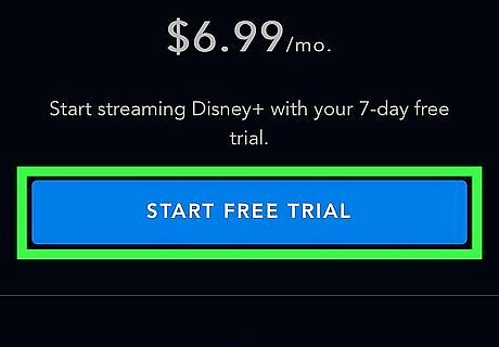 Click the blue Start Free Trial button. It's on the left side of the screen. As of November 2019, Disney+ is offering a package deal—you can get Disney+, Hulu, and ESPN+ as a bundle for just $12.99 USD per month. If you'd prefer this deal, click BUY NOW instead of START FREE TRIAL. There is no free trial available with this option.