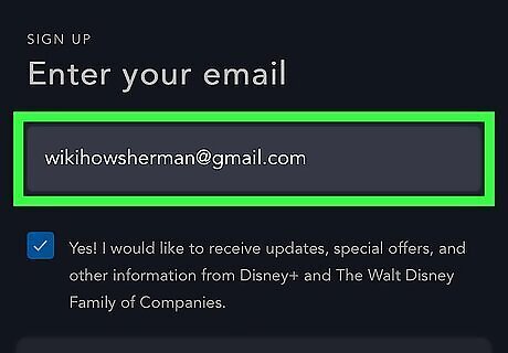 Enter your email address. You'll use your email address to sign in to the service. If you're okay with Disney sending you updates and special offers, you can leave the blue-and-white checkmark in place. If not, click the checkmark once to decline.