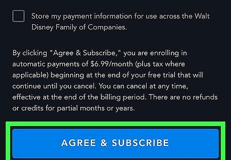 Click the blue AGREE & SUBSCRIBE button. It's at the bottom of the form. Once your payment is approved, you can start watching Disney+ programming on your computer, phone, tablet, streaming device. To manage your account and billing details, sign in to Disney+, click the Profile link at the top-right corner, select Account, and chose Billing Details. To cancel your subscription (including the trial), access your Billing Details click Cancel Subscription, and follow the on-screen instructions.