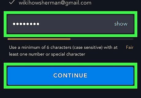 Create a password and click CONTINUE. Your Disney password should be at least 6 characters long and contain at least one number or symbol in addition to letters.