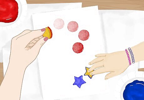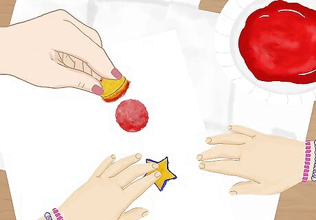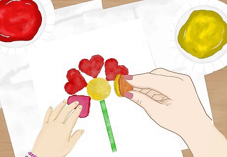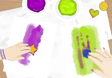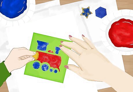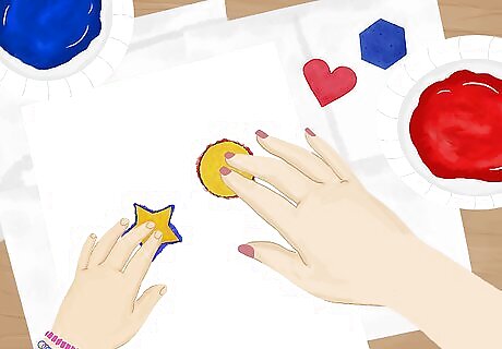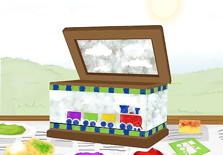 Decorate a wooden toy chest with your kids. Paper and fabric aren't the only options for painting! Get a wooden toy chest or crate, and paint it using larger sponge shapes. Acrylic craft paint will work the best for this, but you can use non-washable tempera paint too. Make sure that the tempera paint is labeled "non-washable," otherwise it will come off if it gets wet.