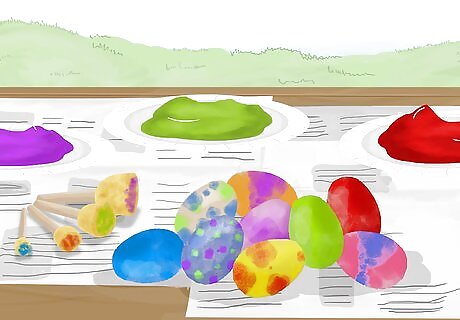 Use sponge paint instead of dye to color Easter eggs. Instead of working with messy liquid dyes, sponge paint pictures and designs onto the eggs. You may need to craft stands or hold the egg for your kids as they paint, since holding and painting might be difficult for younger ages. Blow the yolks and whites out of the eggs first. This way, you can still eat the eggs. If you want to paint whole eggs, hard boil them first, and be sure to use non-toxic paint.