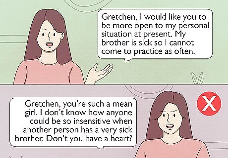 Recognize the difference between assertive and aggressive responses. Being assertive means you stand up for yourself and share your thoughts and feelings with others. You do not want to hurt others with your words. Instead, you want to make your point known. Aggressive language occurs when you belittle others. You might be proving your point at the expense of another. Assertive communication would be: “Gretchen, I would like you to be more open to my personal situation at present. My brother is sick so I cannot come to practice as often.” See be assertive for more tips. Aggressive communication would be: “Gretchen, you’re such a mean girl. I don’t know how anyone could be so insensitive when another person has a very sick brother. Don’t you have a heart?” Being assertive is all about expressing your boundaries and limits.