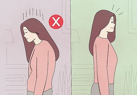 Use assertive body language. Stand tall with your shoulders back. Don't slouch or lean against a wall. Keep your head high and look people in their eyes. Rather than crossing your arms, keep them at your sides or even on your hips. If sitting, keep your legs uncrossed with your feet planted firmly on the floor.