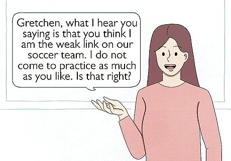 Summarize another’s thoughts. After your conversation partner has finished speaking, repeat what you have heard. This will help prevent any misunderstandings. It will also demonstrate that you are trying to understand the other person. For example, you might say: “Gretchen, what I hear you saying is that you think I am the weak link on our soccer team. I do not come to practice as much as you like. Is that right?”