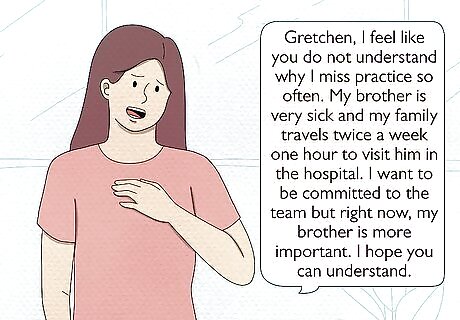 Do not be defensive. When standing up for yourself, try to state facts. Do not just defend yourself. For example, saying, “Gretchen, you’re being unfair!” will be ineffective. Although it is important to say when someone hurts your feelings, explain why. Saying that you’re sad helps if people know the reason. Try the following: You might say, “Gretchen, I feel like you do not understand why I miss practice so often. My brother is very sick and my family travels twice a week one hour to visit him in the hospital. I want to be committed to the team but right now, my brother is more important. I hope you can understand.”