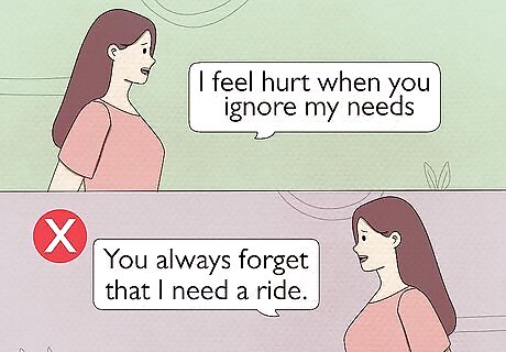 Lean towards “I” statements. Instead of using the accusatory “you,” frame your responses with “I.” For example, “I feel hurt when you ignore my needs” rather than “You always forget that I need a ride.” By keeping the focus on “I,” you are less likely to issue blame. Instead, you open a dialogue. Frame the conversation around your feelings instead of treating your opinions like absolute fact. Try to be as specific as possible instead of making generalized statements.