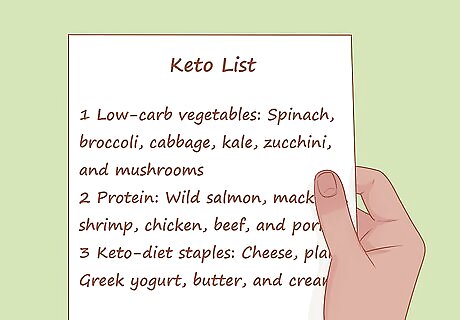 Go to the grocery store with a keto shopping list in hand. Fill your shopping cart with low-carb vegetables, seafood, grass-feed meats, nuts and seeds, dairy products, eggs, and oils. If you’re unsure what foods you should or should not buy while on a low-carb, high-fat diet, you can search for a keto shopping list online. These shopping lists include hundreds of keto-friendly food items, and give you information about foods’ net carb, fat, protein, and calorie levels. Low-carb vegetables include: spinach, broccoli, cabbage, kale, zucchini, and mushrooms. Wild salmon, mackerel, shrimp, chicken, beef, and pork are great sources of protein and healthy fats when you’re on a keto diet. Cheese, plain Greek yogurt, butter, and cream are also keto-diet staples. Check the nutrition labels on any packaged foods before you buy them to make sure they’re low-carb. Low-carb options typically have less than 5 grams of total carbohydrates per serving.