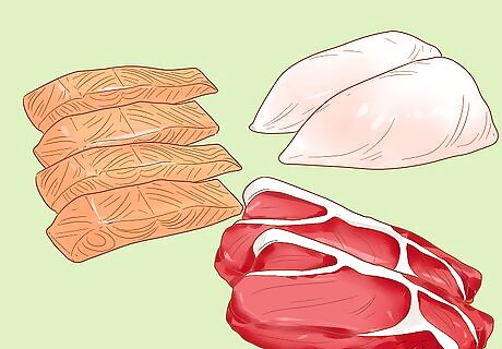Try to keep your consumption of protein to a moderate level. Stick to the recommended amount of protein for your body weight and no more. Try to eat 1 gram of protein per day per 1 kilogram (2.2 lb) of your body weight. Fish, grass-fed meat, full-fat dairy, and pasture-raised poultry are all great carb-free sources of protein. Eating more protein than your body needs can reduce ketosis because your body converts excess protein to glucose. Choose fatty cuts of meat instead of lean cuts so you can get some extra fat in your diet. While on a ketogenic diet, you’ll get around 15-20 percent of your daily calories from protein.