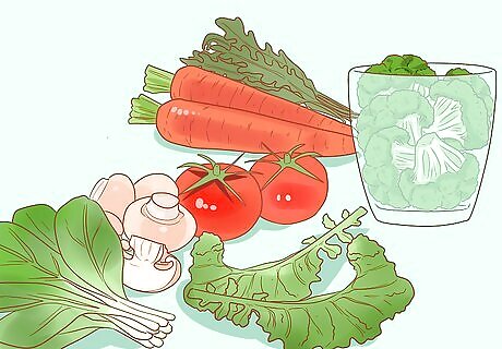 Fill your meals with non-starchy vegetables. Be sure to eat a variety of vegetables to give your body all the nutrients it needs. Prepare your meals so that you plate includes a mix of leafy greens, carrots, cabbage, spinach, peppers, mushrooms, tomatoes, and kale. Low-carb vegetables like cucumber, zucchini, and asparagus are also great substitutes for high-carb whole grains, especially when you’re first starting your ketogenic diet. On a low-carb diet, you’ll get all your carbohydrates from cruciferous vegetables, like: cauliflower, broccoli, cabbage, and Brussels sprouts.