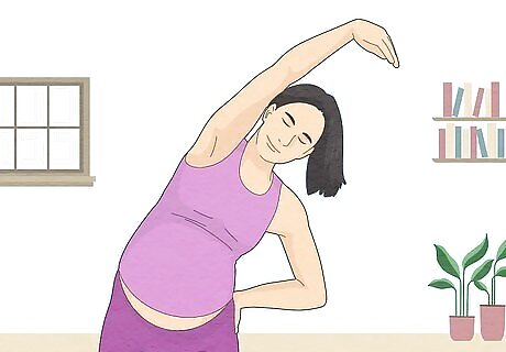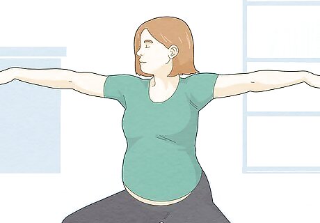 Practice regular yoga or Pilates. Try a yoga or Pilates class either in a studio or online. These lower-impact activities can help strengthen and stretch your muscles while helping you to relax. There are a wide variety of video-based yoga and Pilates courses available. You may consider purchasing DVDs, which can offer basic guided sessions for you to follow. You can also search online for videos or courses that guide you through different levels of yoga and Pilates sessions. You may be able to attend a class or find a video of a pre-natal yoga class, which is tailored specifically to a pregnant body and helping it prepare for childbirth.