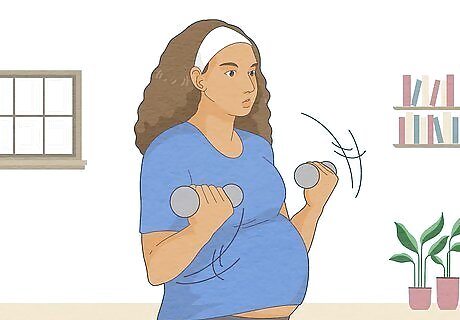 Perform strength-training exercises. In addition to cardiovascular exercise, strength training can help you maintain your fitness. It may also help prepare you for childbirth, recover more quickly, carry around your baby without tiring. Before you begin any strength training program, consult with your doctor and maybe even with a certified trainer, who will create the best plan for your abilities and needs. Focus on exercises that strengthen your whole body and are specific for your needs during and after pregnancy. For example, bicep curls can help you prepare to carry a baby and a diaper bag. Leg strengthening exercises will help support the weight of your growing body.