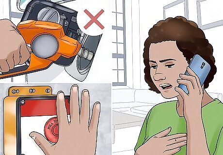 Know what to do if a fire starts. Do not remove the nozzle. Just follow the steps in this article instead. Locate the emergency shutoff (which will usually be by the store), activate it, and then call the fire department immediately. Use the nearest emergency phone to do so, failing that you should get to a safe location (away from the gas station and out of the way) and then make the call using your cell phone or get a bystander to do it for you as soon as possible. Failing that, you should go to the nearest public call box and make the call from there.