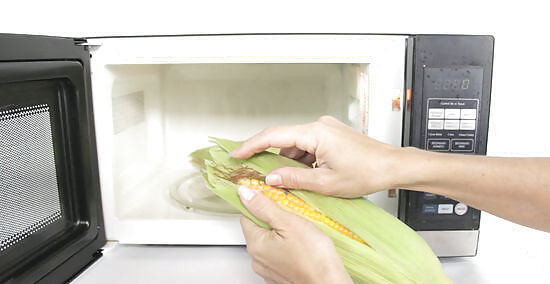 Let the corn cool and clean it off. Be careful handling the corn when it comes out of the microwave, as it will be quite hot. Let the corn cool on a plate or cutting board for a few minutes. Once the tops have cooled down enough to handle, clean the husks and silk off the corn. Grasp the husks and silk at the top of the ear and pull down and away from the corn. Work carefully, as the corn inside may still be quite hot. Enjoy your corn!