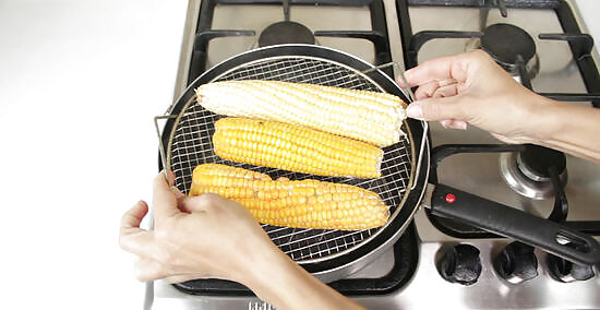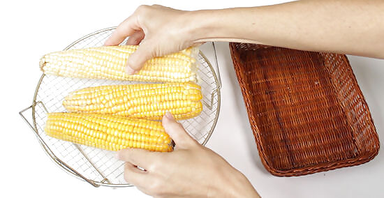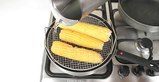 Put the corn in the steamer basket and bring the water to a boil. Lay the corn in a single layer in your steamer basket. It may be necessary to break the corn cobs in half in order to get them to fit properly. It is fine if the ears touch each other, but they should not stack.