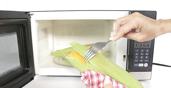 Microwave the corn for 3-5 minutes. The amount of time may vary slightly depending on the strength of your microwave. Ideally you want the corn to be soft and tender when it is done. Tender corn should pierce easily with a fork or knife when the kernels are poked. Adding more time will result in slightly softer corn. If you prefer to clean the corn before putting it in the microwave, wrap the cleaned ears in damp paper towels to help keep them moist while cooking. Another way to cook already-cleaned corn is by putting the ears in a single layer on a plate, and covering them with a second, inverted plate in order to help hold the steam around the ears. Do not wrap the ears in plastic wrap to microwave them. The microwave can easily melt the thin plastic.