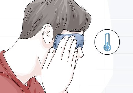 Hold a cold compress against your eye for extended relief. Wet a soft, clean washcloth underneath cold water and wring it out as much as possible so it isn’t dripping wet. Tilt your head back and close your eyes as you set the compress on your face. Press the compress against your eyes with your palms and hold it in place for 5–10 minutes. Pat your face dry with a clean towel when you’re finished to help remove any irritants on your face. If possible, boil water and let it cool in your fridge completely before wetting the compress to ensure it doesn't contain any bacteria or contaminants. Don’t leave your eyes open while applying the compress.Variation: You can put ice cubes in a plastic bag and wrap a towel around it if you don’t want to use a damp towel.
