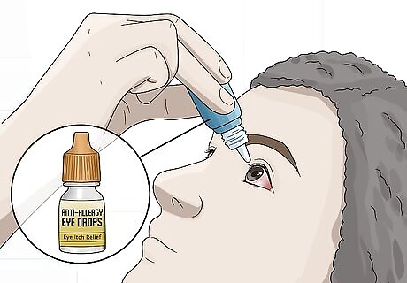 Try anti-allergy eye drops whenever your eyes are red or itchy. Wash and dry your hands thoroughly to ensure there isn’t any pollen on them. Shake the bottle of eye drops and remove the cap. Tilt your head back, pull your bottom eyelid down with your finger, and look straight up. Squeeze 1 drop into your eye and slowly close your eyelid to spread it around. Repeat the process in your other eye. You can buy anti-allergy eye drops from local drugstores or pharmacies without a prescription. Avoid touching the dropper against your eye since it could contaminate the bottle. Don’t close your eyes tightly, or else the eye drops may squeeze out. You can also spray a saline rinse into your eyes to clean them. Saline rinses are available at most drugstores or pharmacies.Tip: If possible, start using eye drops about 1 week before you start feeling itchiness from hay fever since it may take some time to feel relief.