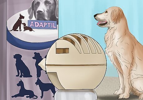 Try using pheromones. There are medications on the market that use natural dog pheromones to calm your dog. The come in plug-in diffusers and can also be applied to a bandana around your dog's neck. Researchers are investigating which hormones work best for calming distressed dogs. One researcher has used a hormone emitted by mother dogs to calm their puppies to great effect with dogs scared of storms.