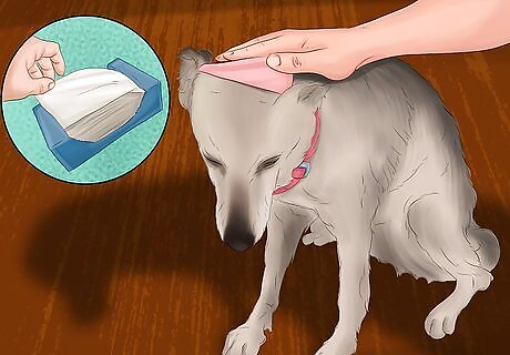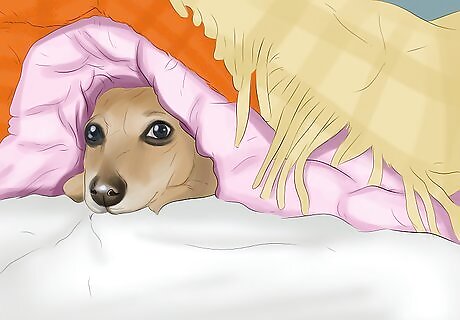 Use dryer sheets to eliminate static on your dog's coat. It may sound weird, but many dogs dislike lightning because it causes static in their fur. Rubbing your dog down with a dryer sheet will help make the uncomfortable sensations go away. It may even help the dog get back to sleep if it wakes up due to the storm. Do not let the dog chew dryer sheets. Once you rub it on your dog's coat, put it out of reach of the dog. It can make a dog very sick.