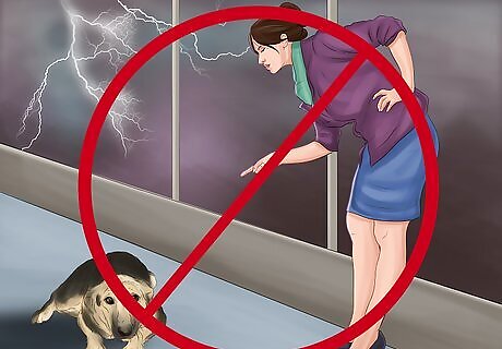 Don't scold your dog for showing fear during a storm. Just as you don't want to overly comfort the dog, you don't want to punish it for being scared. That only gives your dog another reason to be afraid. Remember that fear is a Instead, go about your normal routine and act as if everything is normal. This doesn't mean ignore your dog, it just means that you should interact with it as normal. Ignoring the thunder and lightning, as well as the dog's nervousness and fear, will eventually teach your dog that nothing is wrong. This can be hard to do, however, as the dog's behavior is the meantime may be erratic and fearful.
