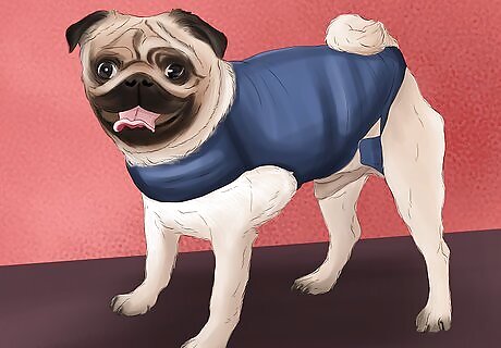 Put a body wrap on the dog. There are several products on the market that are basically coats to put on your dog. These coats put gentle pressure on the dog's body, which calms it immensely. Calming body wraps are sold in most pet stores and online. When you are purchasing one, be sure to get the correct size for your dog.