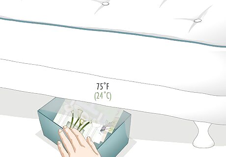 Keep photos in an area that’s below 75 °F (24 °C) and has low humidity. Choose a place that doesn’t receive a lot of light and is away from moisture, such as under your bed, in a closet, or inside of a cabinet drawer. Make sure the temperature doesn’t regularly go over 75 °F (24 °C) since it could damage your photos. Check the humidity using a hygrometer to see if it’s between 15–65%, or else your photos will age more quickly. Avoid storing photos in a garage, attic, or basement since moisture can build up and cause the photos to warp. If you’re putting photos in a storage unit, make sure you can control the climate so your photos don’t age.Tip: Label the outside of your storage boxes or albums so you can find certain photos faster when you need them.