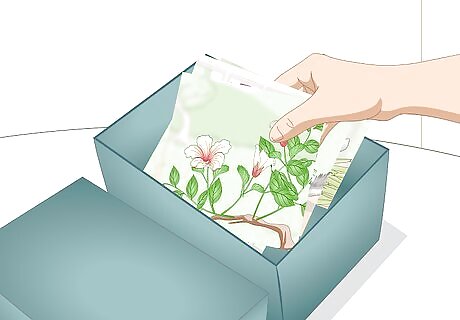 Store the photos in acid-free boxes for more condensed storage. Get a photo storage box that’s tall enough for your pictures to stand up straight and is labeled “acid-free.” Put your sleeved photos into the box in the order you laid them out. Fill the box so the photos don’t move around or shift out of place before sealing it closed. You can buy acid-free photo storage boxes online or from photography shops. If you aren’t able to stand the photos up straight, lay them flat on the bottom of the box and carefully stack them so they don’t get damaged. If you aren’t able to get an acid-free storage box, you can also use a shoebox.