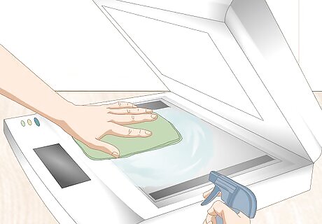 Clean the glass on a scanner with a lens cleaner and lint-free cloth. Open the scanner to reveal the glass scanning surface. Spray the lens cleaner onto the cloth and wipe the glass in a circular motion to remove any dust that’s left on the surface. Make sure there aren’t any streaks on the glass, or else they’ll be visible on your photos when you scan them. Close the scanner so dust doesn’t land on the glass. If you don’t have a scanner at home, you may be able to find one at your local library or a print shop. As an alternative, you can download an app named PhotoScan and scan photos with your phone. Keep in mind though that if you have a lot of photos to scan, the process will be time-consuming.