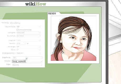 Name and scan the images onto your computer. Press the Preview button on your scanner or computer to do a pre-scan so you can see if the photos look okay. If you like how the photos look after the preview, type in a short file name into the box on your screen before clicking “Scan.” The scanner may take a few seconds or minutes to digitize your photographs. For example, you could name a file “family_vacation98” so you can go back and find the images later.Variation: If you don’t have a scanner, lay the photo flat on a table and make sure it’s well lit. Use a camera or your phone to take a picture of the photo from above.