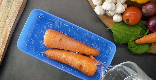 Put carrots in a container of water in the fridge. Trim off the leafy carrot tops and then place your carrots into a plastic container. Fill the container with water until the carrots are completely covered. Put the lid on the container, and then place the container in the fridge. Change the water every 4-5 days. Carrots can last up to a month when stored this way.