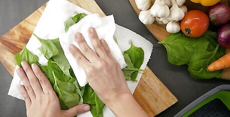 Rinse and dry leafy greens when you bring them home. Leafy greens include lettuce, bok choy, chard, kale, and spinach. Even if the greens are pre-washed, it’s a good idea to rinse them again. You can dry them with a salad spinner or blot them with paper towels.
