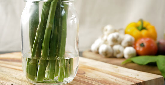 Keep asparagus in a glass of water in the fridge. Trim 1 inch (2.5 cm) off the bottoms of your asparagus. Stand the asparagus up in a jar with 1 inch (2.5 cm) or water. If you don’t have a jar handy, you can also use any kind of glass or measuring cup. Make sure all the asparagus ends are in the water. If you want, you can loosely cover the asparagus tops in plastic wrap to keep out odors, but you don’t have to. The asparagus should stay fresh for up to 7 days.