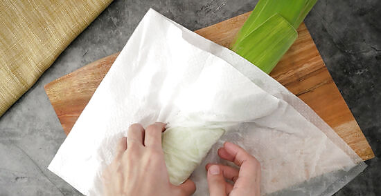 Wrap leeks in a damp paper towel and plastic before refrigerating them. The damp paper towel will help keep your leeks fresh, and the perforated plastic bag will contain the moisture. Don’t put your leeks in the fridge unwrapped, because their odor will be absorbed by other items in your fridge. Don’t trim or wash your leeks before storing them. The leeks should stay fresh for about 10 days.