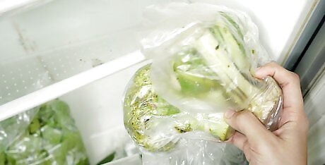 Store broccoli, cauliflower, cabbage, and turnips in plastic in the vegetable crisper. Wrap these veggies in loose plastic, like a partially open plastic bag or perforated plastic. Make sure to keep your broccoli in the fridge, not on the counter, because it will deteriorate in warm temperatures. Put them in the vegetable crisper drawer, if there’s room. Broccoli and cauliflower will last about a week in the fridge, while cabbage turnips will last at least 2. They also freeze well, if you need them to last longer.