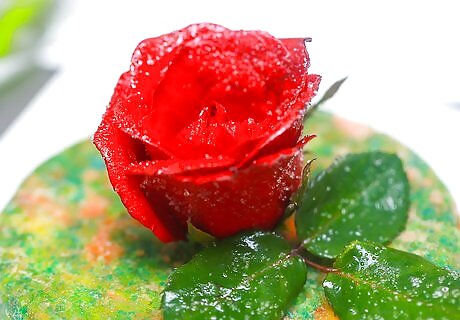 Let dry overnight. Place the flowers on a wire rack or cookie sheet covered in wax paper. Let dry at room temperature until the base is completely dry and the flower is stiff. This takes between 12 and 36 hours. The sugared flowers will be brittle, so take care when handling them. If your oven has a pilot light, you can leave the oven "off" and keep the flowers in with the door closed for 8 hours. Alternatively, set any oven to the lowest setting (no more than 200ºF / 90ºC) and leave with the door ajar for a few hours, checking frequently to avoid burning.