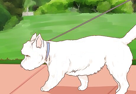 Give the dog moderate exercise. Westies aren't lazy dogs, but nor are they an extremely high-energy breed. One to two daily walks or play sessions a day is usually adequate A total of an hour of exercise is adequate for most Westies. Most Westies will be calm and relaxed indoors if you exercise them twice a day. If you don't, they can become destructive as a way to relieve boredom and let out excess energy.