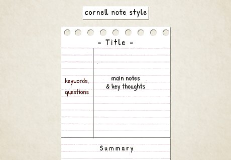 This system isn't good for those who like to copy down every little thing. This is more if you like to get the main things out of a lecture, or if your professor tends to go on and on. To do this style of note taking, take your notebook paper and draw a line horizontally at the top of your paper, and then draw a line vertically along the margin of the paper or a little wider if you write big. Start by tilting your notes with the title of the lecture. Then write main points on the left side of the vertical line and elaborate more on the right side. Studies done by Cornell University have shown that this is the most effective strategy for taking notes.