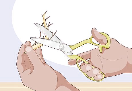 Trim away any thin shoots from your root cutting. If you see any small, hair-thin offshoots on your cutting, use your knife or scissors to trim them away. These will only pull energy away from your cutting as it begins to grow new roots. Try to cut the smaller roots as close to the main root as possible. As you do this, make sure to keep track of which end of your root is the top. Your cuttings won't grow if you plant them upside-down.
