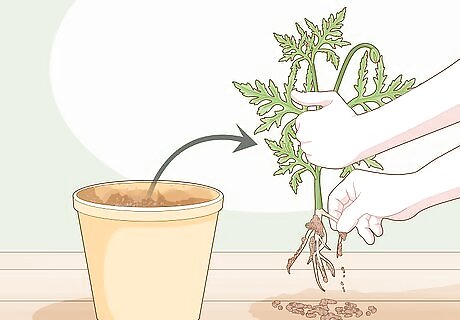 Lay thinner roots horizontally across the soil. Since it might be hard to push a thin root all the way down into the potting compound, try laying them flat on the surface of the container, instead. Press them down so they're nestled into the dirt, then brush a little of the compost over the top. If the roots are sturdy enough to insert vertically, opt for this. However, laying them horizontally is a great option if the roots are very soft.