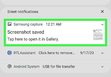 Open the screenshot. To open the screenshot, tap the screenshot thumbnail in the notification that appears after you take a screenshot. If it asks you to select an app to open the screenshot with, tap Gallery and tap Always or Just Once.