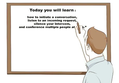 Outline concrete learning objectives for adults mastering new skills. Write specific and concrete learning objectives on the board or pass them around on a handout before each class. This will illustrate the utility of your lessons for your adult learners and give your students a clear idea of the skills they should be absorbing with each meeting. For example, let’s say you’re teaching adults about how to use a new intercom system in an office. A good learning objective might be, “Today you will learn how to initiate a conversation, listen to an incoming request, silence your intercom, and conference multiple people at once.” This creates specific expectations and goals for your students rather than saying, “Today, you will learn how to navigate the new intercom system.”