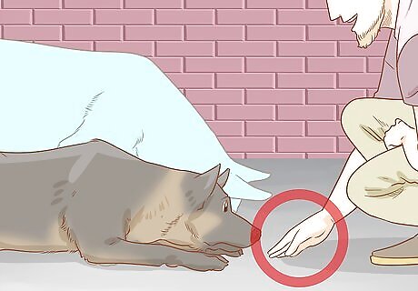 Guide it into a ducking position if necessary. If it doesn’t lower its head and front limbs, gently but firmly guide it into the right position. When you’re just starting out, your dog will probably lower its hind legs, too. Try keeping your hand under its belly so it only lowers the front half of its body.