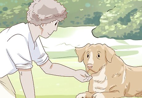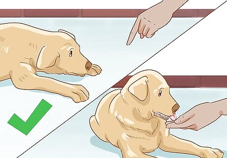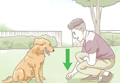 Use your hand to signal as you say the command. Start phasing the food lure out once your dog consistently responds to the treat and command word. Instead of holding a treat in your hand, just use your fingers to signal your dog to duck when you give the command. Hold your hand in front of your dog and lower it to the floor just as you did with the food lure. This will teach your dog to respond to the hand signal instead of the treat.